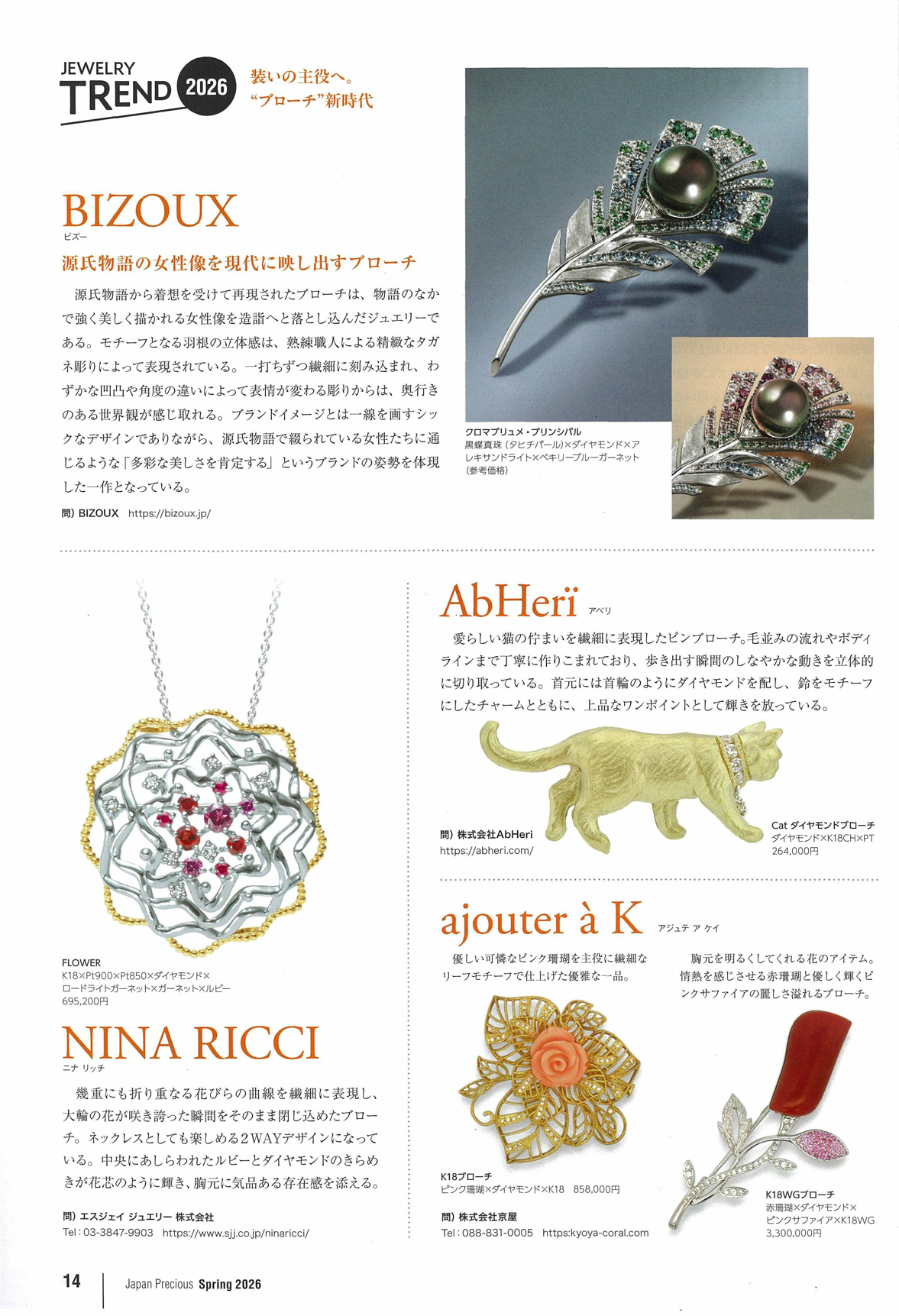 JAPAN PRECIOUS Spring 2026 No.121 2026/01/12 JAPAN PRECIOUS 2026新春号 新春特集 GOLDアイテム「幸運を呼ぶゴールドの輝き」特集で、K18白珊瑚リングや、バラ彫り・花モチーフの優美な新作ブローチが紹介されました。 幸運を呼ぶゴールドの輝き: 太陽のような輝きの白珊瑚K18リング モダンなスクエアフォルムの白珊瑚K18リング 装いの主役へ。ブローチ新時代: ピンク珊瑚のバラ彫りをあしらったリーフモチーフK18ブローチ 赤珊瑚とピンクサファイアが美しく咲くお花のK18WGブローチ2026年のトレンドを象徴する、KYOYA自慢の逸品たちです。 掲載商品: K18 白珊瑚 リング① / K18 白珊瑚 リング(金継ぎ螺鈿)② K18 ピンク珊瑚 ブローチ / K18WG 赤珊瑚 ブローチ この商品について問い合わせる 前の記事 次の記事 株式会社 京屋(珊瑚コーラルジュエリー) > メディア情報 > JAPAN PRECIOUS Spring 2026 No.121